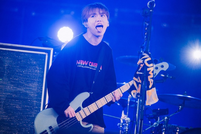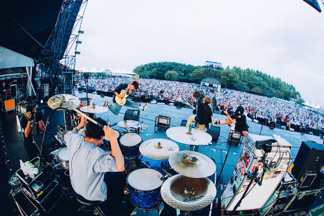 楽曲の最後の短い余韻で「イナズマ!西川さんは俺たちのマイヒーロー!」とGENが叫び演奏されたのはポジティブなメッセージを放つ「My HERO」。ステージにも雨が降り注いでいるが、メンバーたちは気にする様子もなく前方まで来てオーディエンスを煽っていく。続く「GalapagosⅡ」は昨年リリースのアルバム『Harvest』に収録された楽曲。ミドルテンポから始まり、中盤以降にハッとさせれるヒネリの効いたアレンジが心地よい。